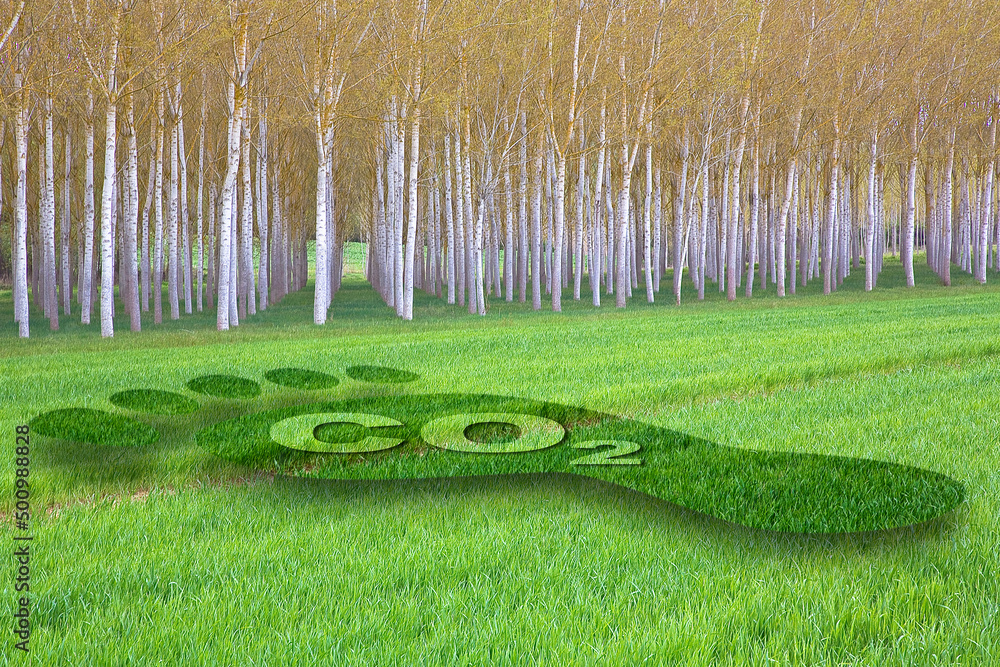 Carbon footprint concept with CO2 text against footprint in grass shape - CO2 Neutral and ecological concept with foot symbol in a rural scene with trees
