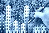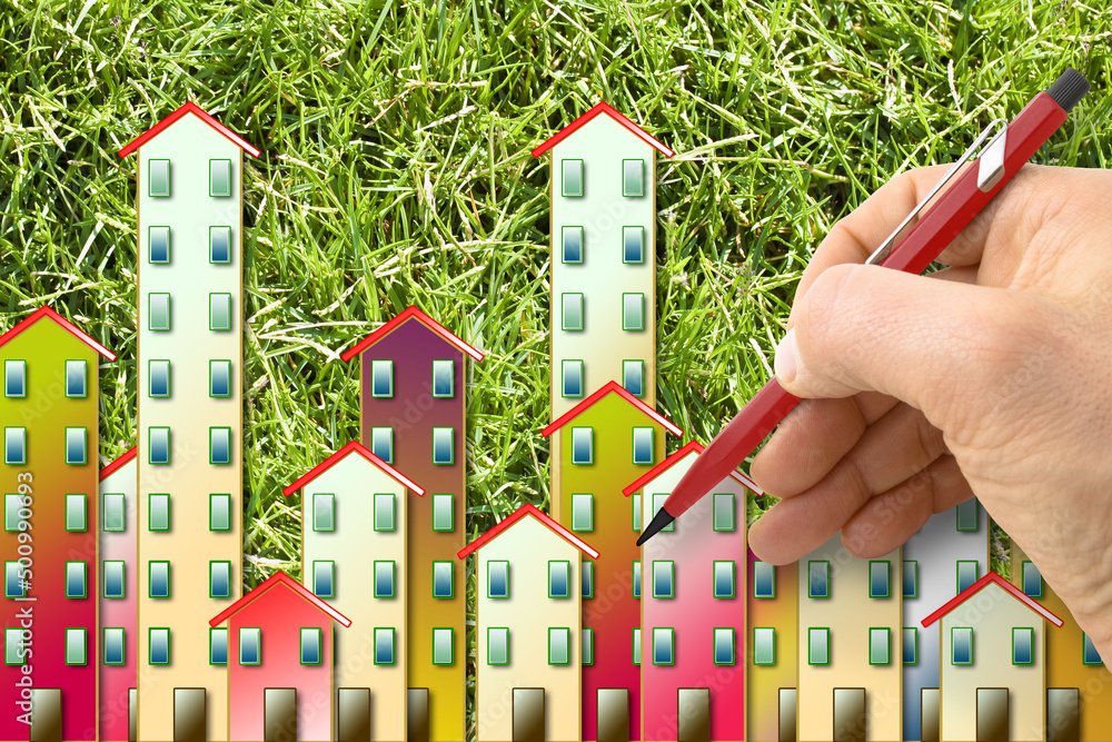 Cities and green spaces - concept with architect drawing a residential district over a green mowed lawn background