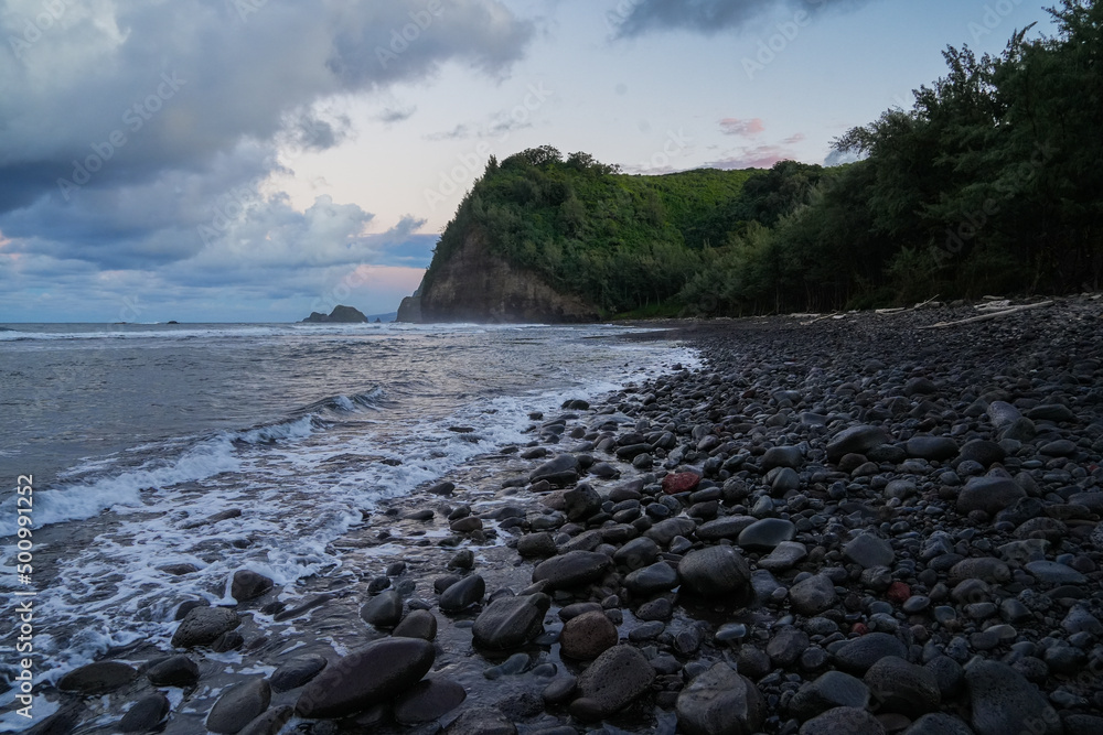 Black pebbles on Pololu Beach in the Kohala Forest Reserve north of Big Island in Hawaii, United States