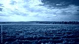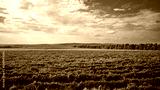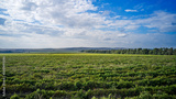 Aerial view of a vineyard plantation on the slope of a mud volcano in Taman. The vineyard is illuminated by sunlight breaking through the clouds.