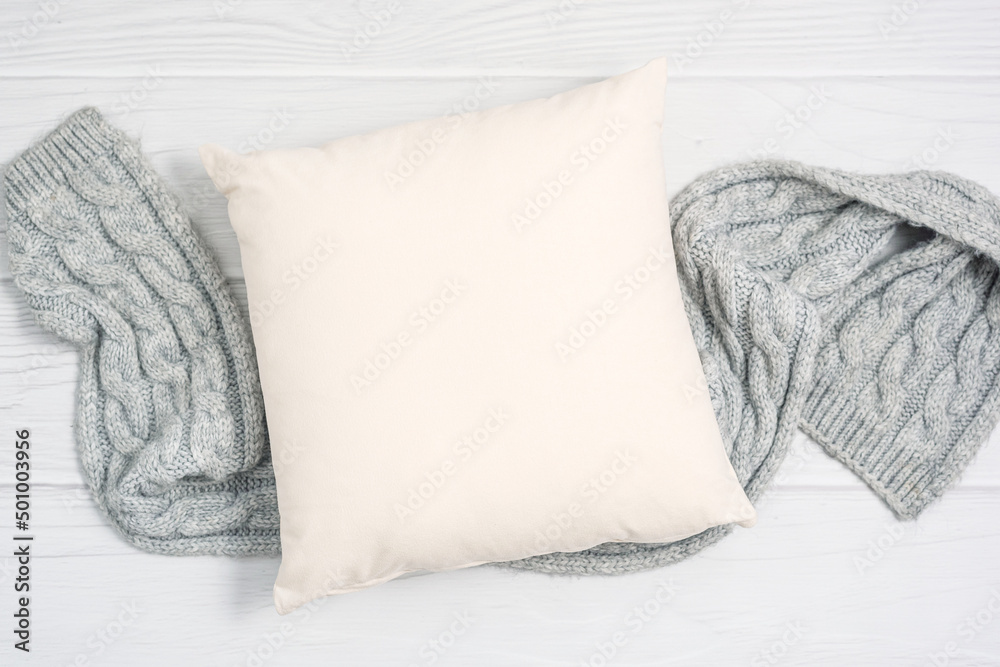 White blank pillow mockup, cozy winter composition with and warm wool scarf, square pillow case, cushion mock up.