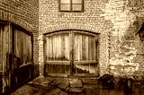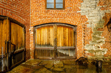 An old brick wall with a large wooden gate.