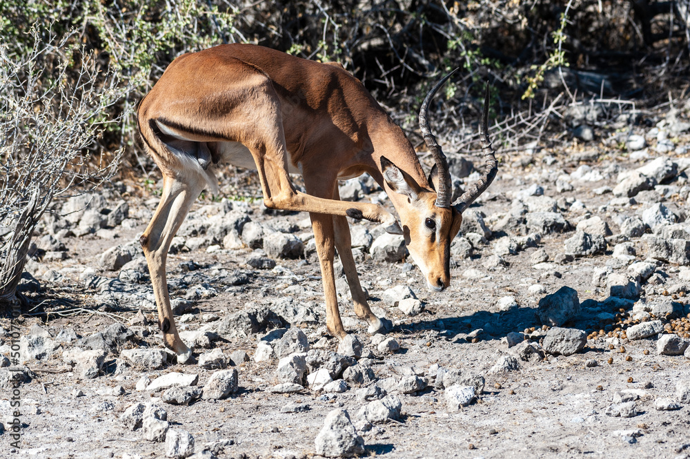 Closeup of a herd of Impalas - Aepyceros melampus- grazing on the plains of Etosha National Park, Namibia.