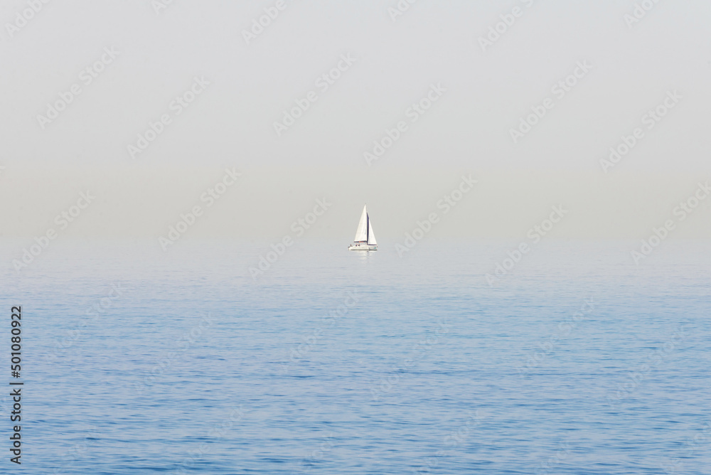 Seascape. Haze over the blue surface of the sea. Yacht on a background of calm sea and blurred horizon.