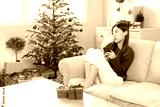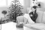 Sad and lonely woman sits on a sofa with gift box, quarantine self isolation on New Year or Christmas season.