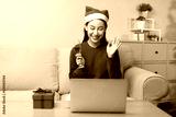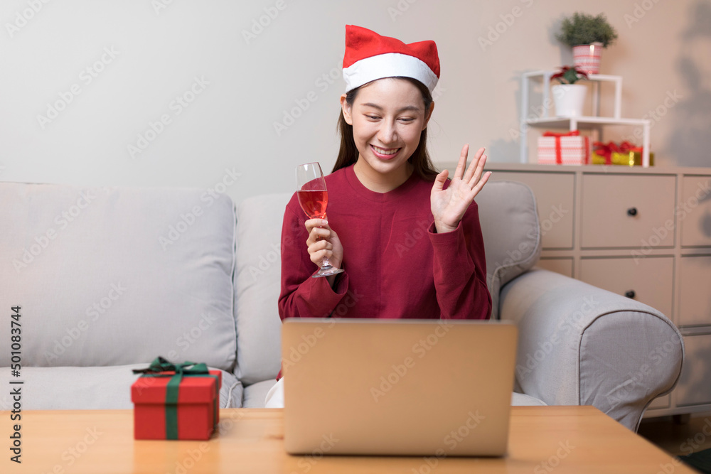 Happy Asian woman in X'mas Santa hat toasting fizzy wine with friend via video call on computer.