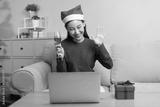 Happy Asian woman in X'mas Santa hat toasting fizzy wine with friend via video call on computer.