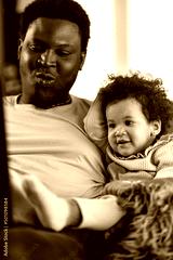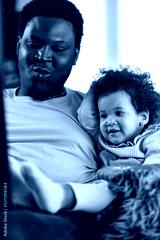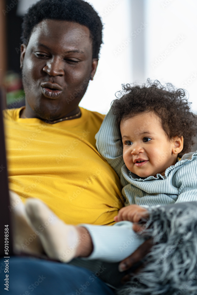 Father sitting in front of a laptop computer with his young daughter. Working from home. Apps for toddlers concept. Mixed race family