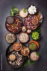 Variety of vegan, plant based protein food, legumes, lentils, beans