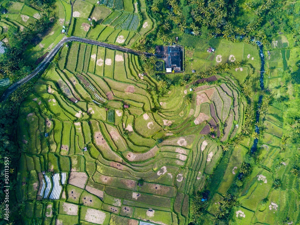 Rice terraces, Bali, Indonesia. Aerial drone view.