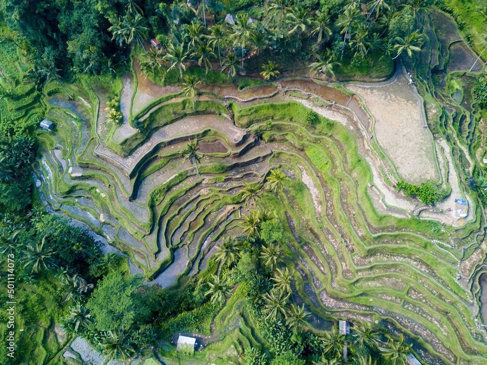 Tegallalang rice terraces, Bali, Indonesia. Aerial drone view.