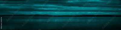 Blue-green clouds over the sea. Toned dark teal water and sky. Background with space for design. The mountains on the horizon. Calm, tranquility atmosphere. Wide banner. Webside header. Panoramic.