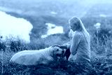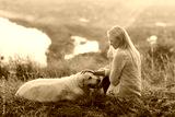 Young woman and golden retriever dog on the hill on green grass. Pets friendly travel concept, solar bright effect.