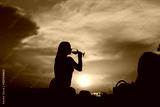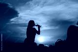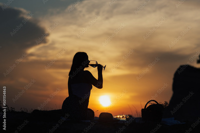Dark silhouette of girl having a picnic and drinking a glass of champagne or white wine. Summer time