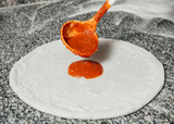 The chef pours tomato sauce over the rolled dough, restaurant concept, kitchen spoon, the process of preparing italian pizza