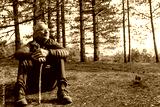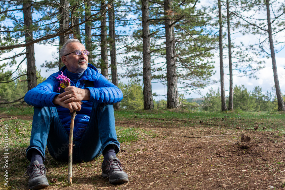Senior man with mountain flowers in hand. Hobbies and leisure