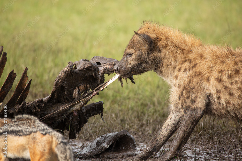 Spotted hyenas Crocuta Crocuta) feeding off a hippo carcass and pulling strips of meat.African wildlife safari seen in Masai Mara, Kenya