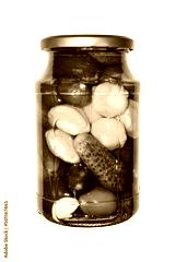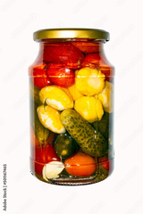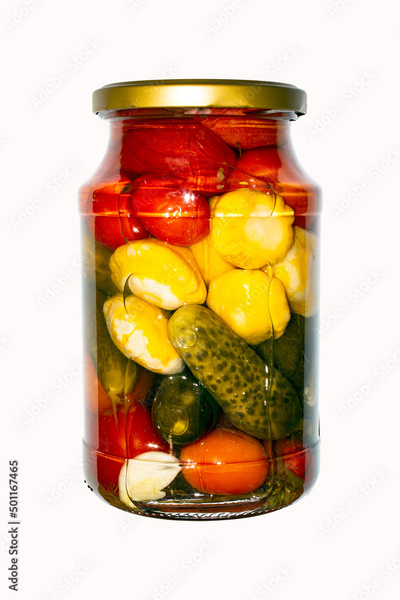 A jar of homemade pickled vegetables on a white background side view.Pickled cucumbers, tomatoes and zucchini in a glass jar.