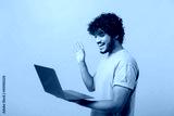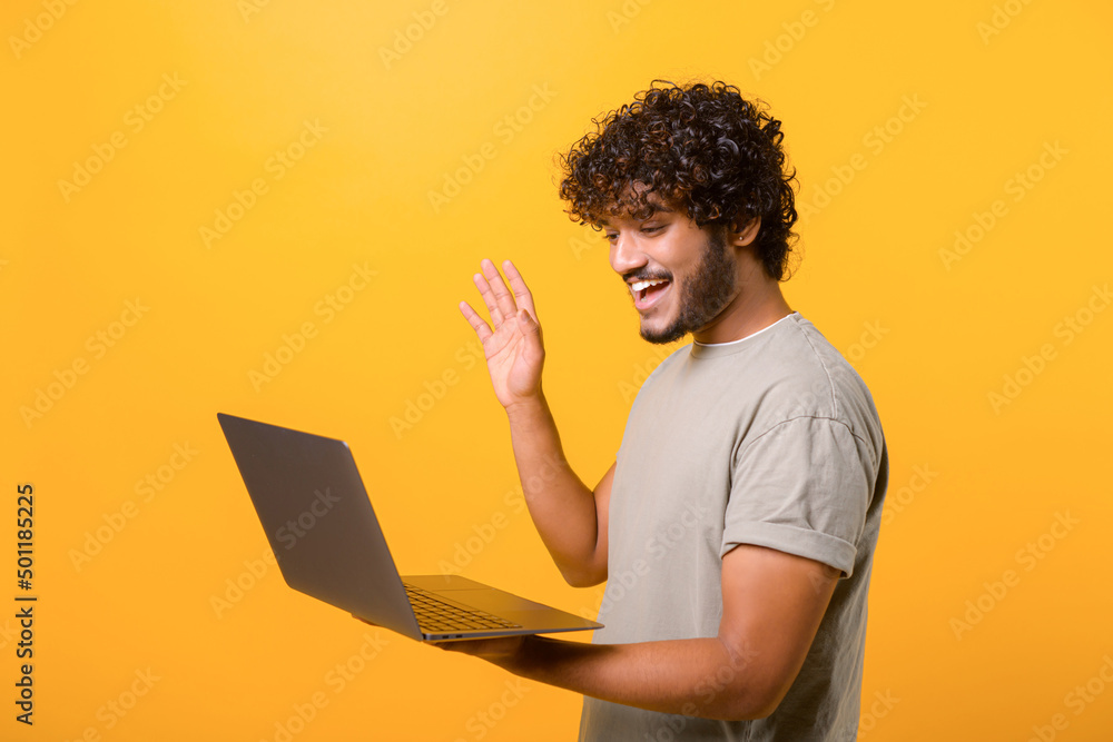 Waist up view of the young Indian man waving with hand and saying hello while chatting via laptop with somebody isolated on yellow background. Video call concept