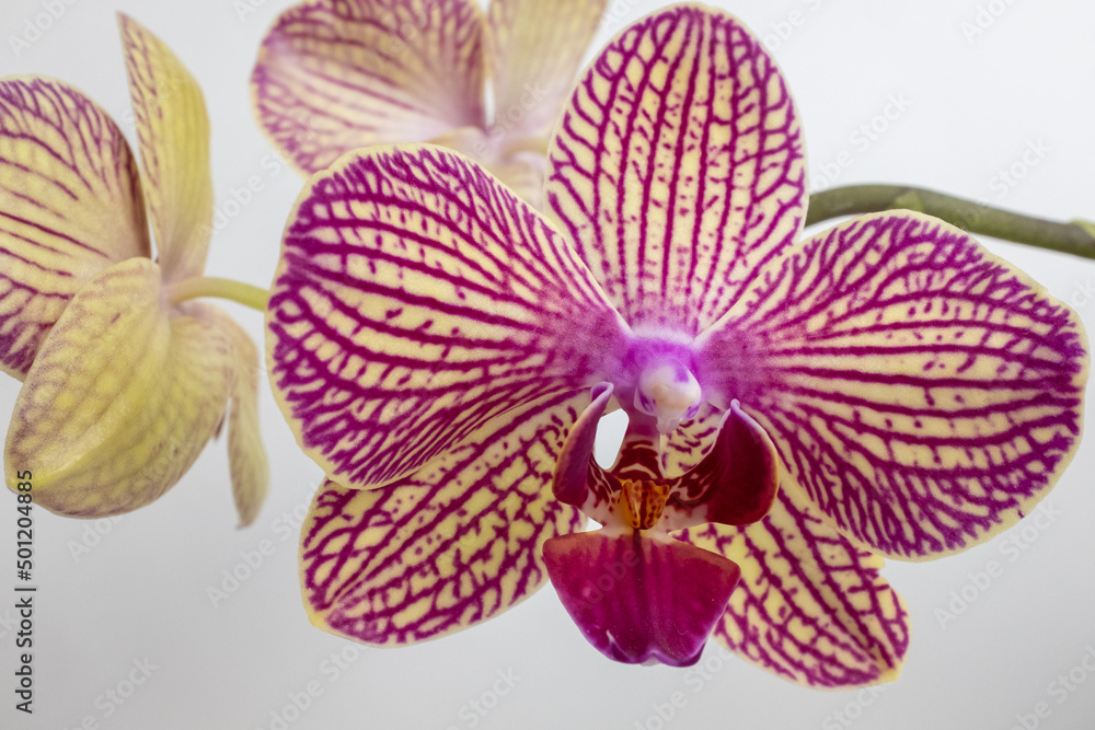 Tiger orchid flower on white background, close up. A bloom phalaenopsis orchid for publication, poster, calendar, screensaver, wallpaper, card, card, banner, cover, website. High quality photo
