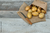 Holzhintergrund mit frischen Kartoffeln in einer braunen Papiertüte .