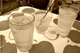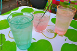 mint and pink colored drinking glasses on table with oilcloth tablecloth