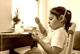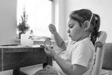 Beautiful caucasian preschool girl playing at home and doing crafts from plastic bottle. Recycle toys and diy creativity