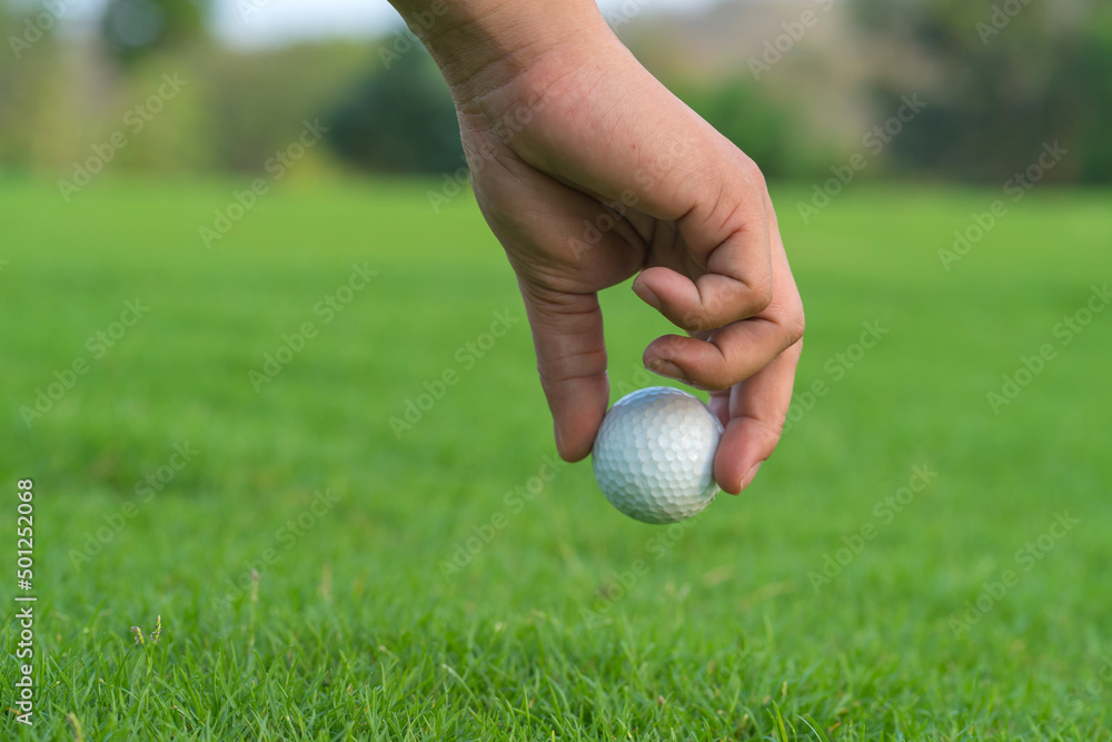 Hand Golfer hold Golf ball with tee ready to be shot at golf court