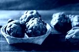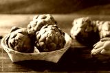 Green artichoke in bamboo basket on wooden background, Edible flower bud