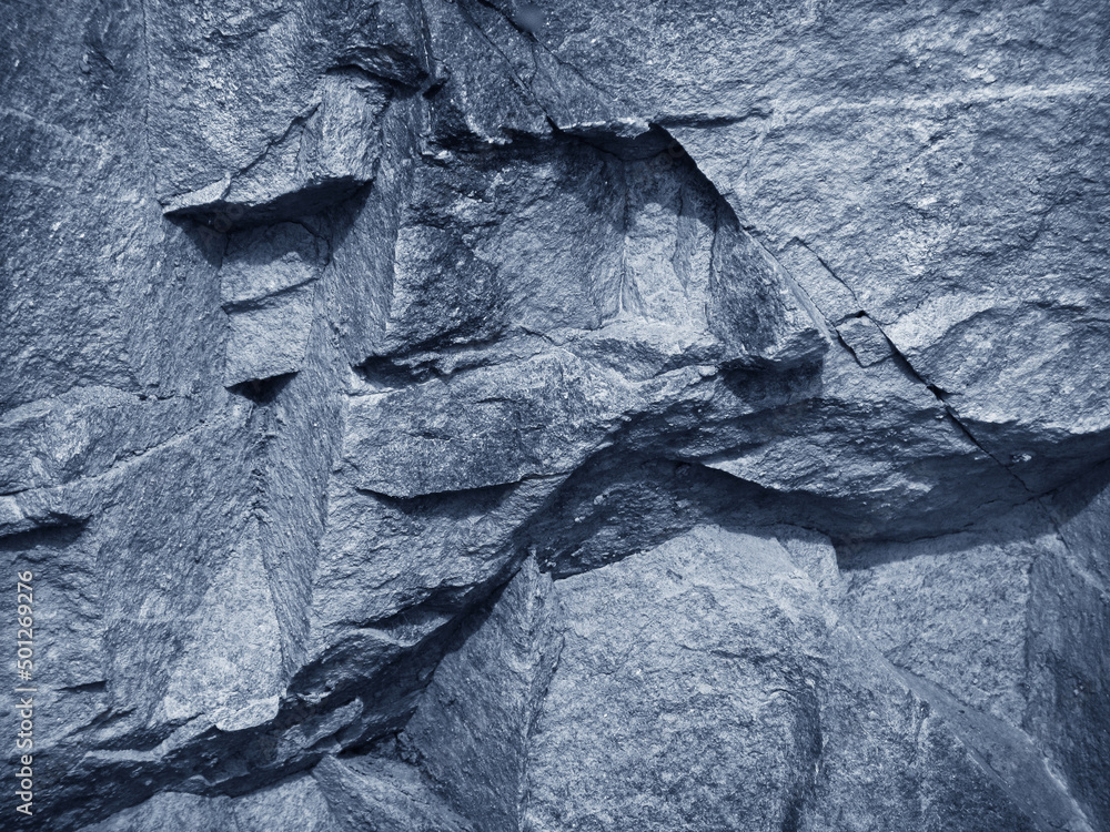 Rock texture. Rough mountain surface. Close-up. Volumetric stone background with space for design. Light silvery blue. Grunge backdrop.