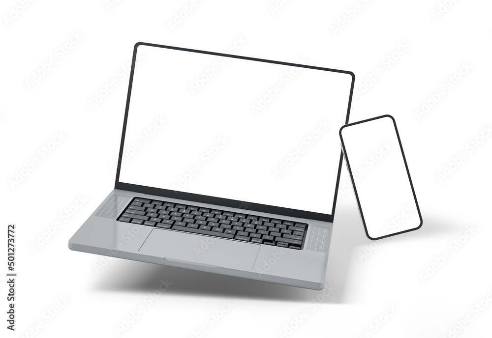 Wearable device and smartphone with blank screen flying, isolated on white background