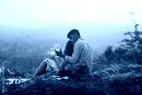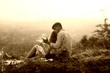 Beautiful young happy couple relaxing together on mountain at sunset with beautiful landscape on background.