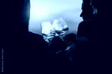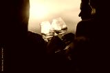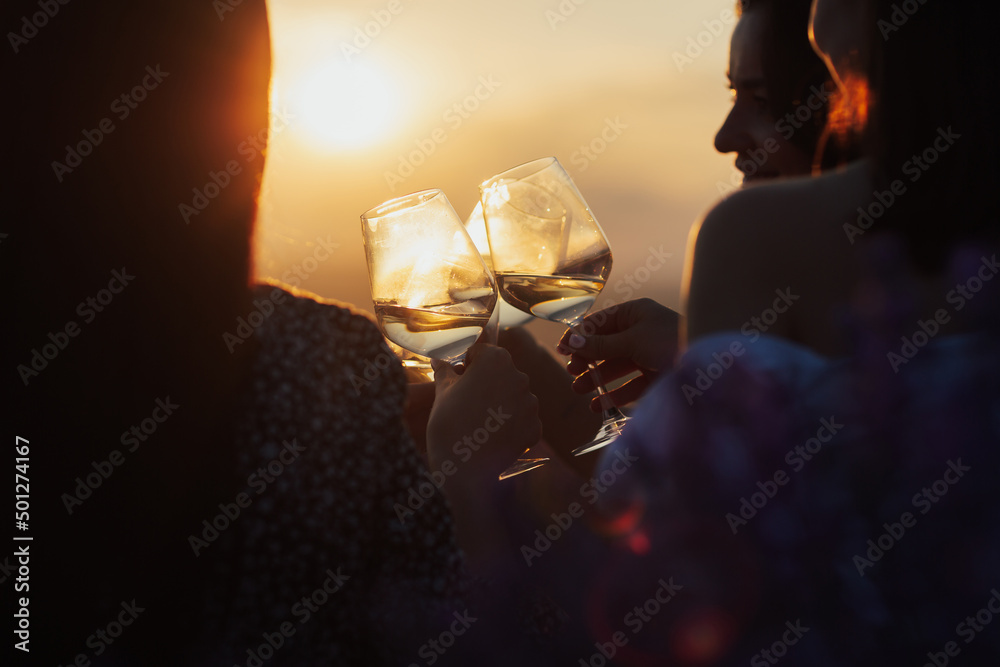 Women together clinking glasses, close-up. A group of girlfriends toasting glasses with wine at sunset.