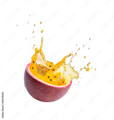 Red passion fruit with passionfruit juice splash isolated on white background.