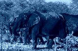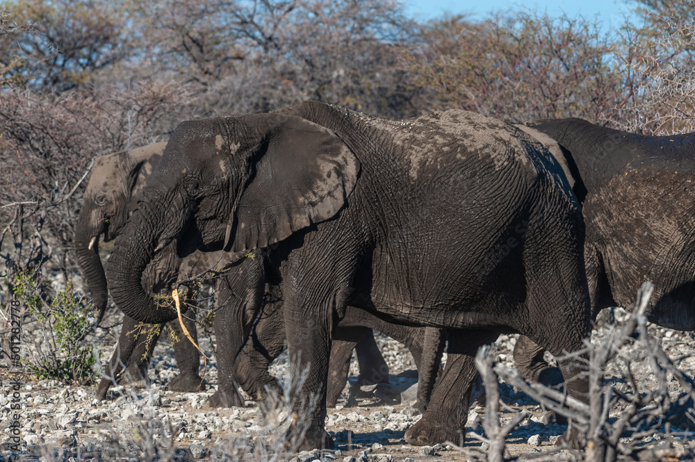 A herd of african Elephants passing along an unpaved country road in Namibia