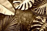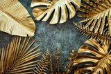 Creative nature gold layout made of tropical leaves. Summer concept. Fern Palm and monstera leaf on wall textures. Nature beach background layout with free text space.