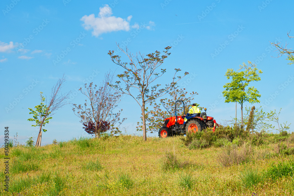 traktor kosiarka łąka niebo drzewa