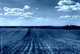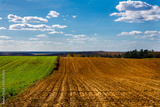 Widok na wiejskie wzgórza z dwoma polami złocistymi i zielonymi. Czas złotej godziny