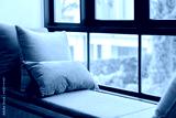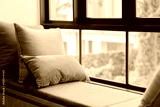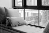 Close-up of beige earth tone pillow cushion set arrange on window bench booth in living room interior design home swweet home ideas concept