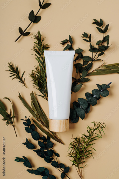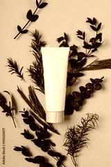 Cream tube with green herbs on pastel background. Cosmetic bottle mockups for branding and packaging presentation. Natural skincare beauty product concept.