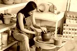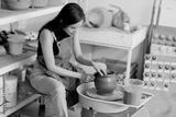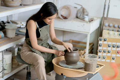 Close up of female hands working on potters wheel,asian female sculpture woman shaping mold small vase bowl clay on potter's wheel at home studio workshop art and creation hobby concept
