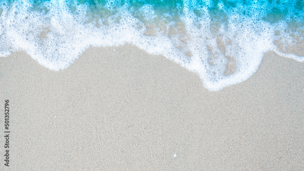 Beach sand sea water summer background. Sand beach desert texture. White foam wave sandy seashore. top view