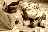 Carpenters tool kit, hammer, chisel and plane on a wooden background with shavings.