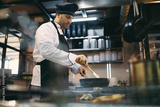Professional cook prepares meal while working in the kitchen at restaurant.