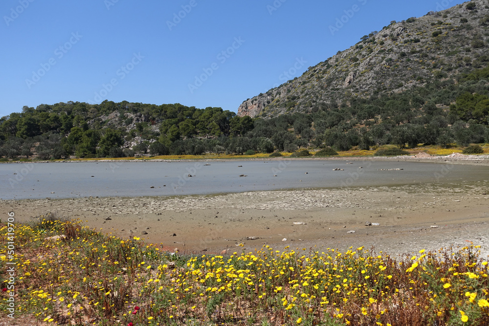 Paradise bay and small port with turquoise beach of Aponisos in island of Agistri, Saronic Gulf, Greece