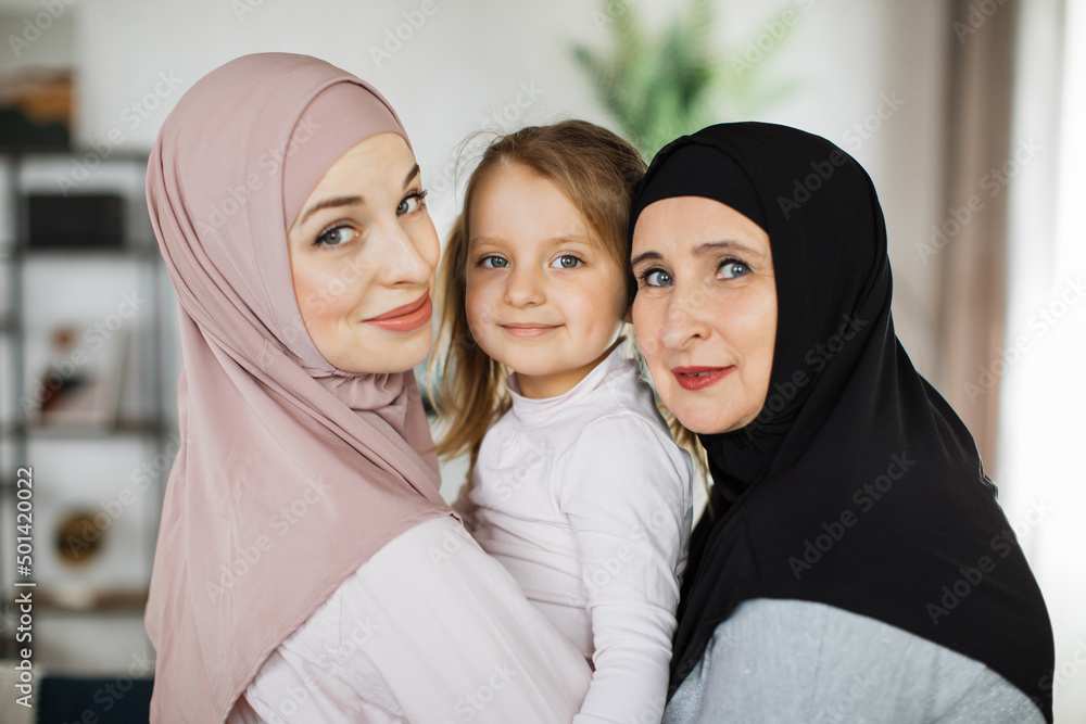Muslim grandmother, daughter and grandchild together at home, happy domestic life moments. Family having fun, concepts about elderly, mult-generation islamic family and relationship