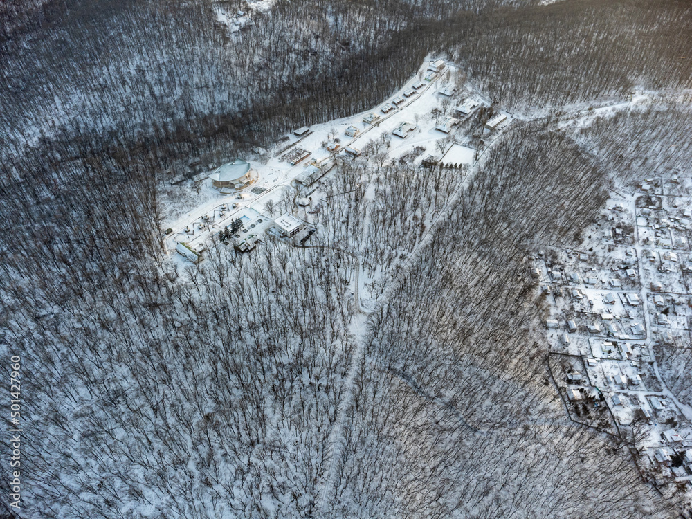 Winter aerial view on village surrounded by forest covered in white snow. Ukraine from drone