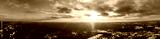Winter aerial epic view on snowy countryside panorama. Zmiyevsky region in Ukraine from drone. Sun shines through heavy sunset clouds