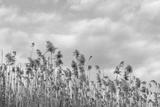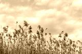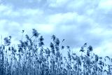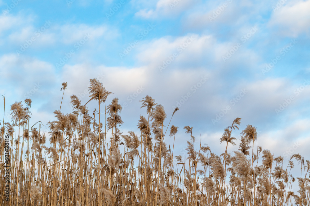 Dry fluffy reed, cat-tail grass on nice blue cloudy sky background. Wintery natural botany in evening light