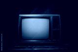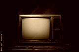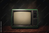 Old green retro TV It's still life on wood table, dark background